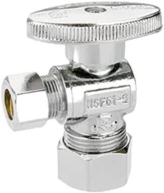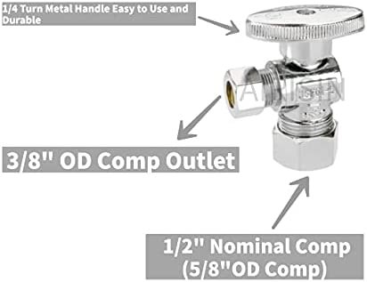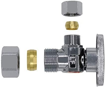 1/4 turn angle stop valve is 1/2″ Nominal Comp (5/8″OD Comp) inlet x 3/8″ OD Comp outlet with cUPC, NSF372, and NSF61-9 certification. Shut off valve is a Chrome plated and lead-free brass structure with solid metal ball and brass pressure ring(Except for the handle and compression nut ). More sturdy and durable than plastic valves.