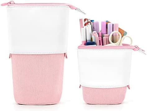 Telescopic Pencil Box: There are two cute handles on both sides of the kawaii pencil case, the top can be pull up or slid down to adjust the height of the stand up pencil case, Pull the pouch up and down to transfer it. Size: 7×5.1×2.36in