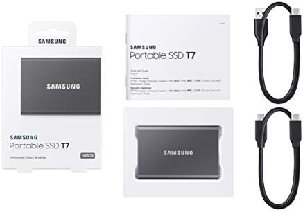 The Samsung Portable SSD T7 is the next standard in external storage. With transfer rates up to 9.5x faster than traditional external hard drives and read/ write speeds up to 1050 MB/s, you can move massive files around with unparalleled ease and fluidity. Its sleek, shock-resistant design is uncommonly durable, capable of withstanding drops from up to 6ft, so you can take it on-the-go with complete peace of mind. The T7 is compatible with PC, Mac, Android devices, gaming consoles, and more. Included in the box are USB Type C-to-C and Type C-to-A cables for added convenience. All firmware and components, including Samsung’s world-renowned DRAM and NAND, are produced in-house, allowing end-to-end integration for quality you can trust.Performance may vary depending on host configuration. To reach maximum read/write speeds of up to 1,050/1,000 MB/s, respectively, the host device and connection cables must support USB 3.2Gen 2 and the UASP mode must be enabled. Based on internal test results compared to a Samsung external HDD 1TB (HX-MTD10EA). Test system configuration: ASUS Z370 ROG MAXIMUS X APEX (USB 3.2 Gen 2 Type-C), Intel Core i7-8700K CPU 3.70GHz(Coffeelake), OS-Windows 10 RS6. Based on an internal free fall shock test conducted under controlled conditions. For more information on the warranty, please visit www.samsung.com/us/support/warranty/. According to the Samsung internal quality standards for heat management and safety, T7 maintains its outer casing temperature below 118.4o F, except when the ambient temperature is above 118.4 F. Software requires Windows 7 and higher, Mac OS X 10.10 and higher, or Android 5.1 (Lollipop) and higher. Older versions of the Windows, Mac, and Android operating systems may not be supported. Firmware update requires PC or Mac and internet connection. Android app available on Google Play. Compatibility with host devices may vary. Some operating systems may require T7 Touch reformatting. Please find the compatible devices list on Samsung.com/support. T7 Touch is compatible with USB 3.0 and USB 2.0. Source: 2003-Q3 2020 IHS Markit data: NAND suppliers’ revenue market share.