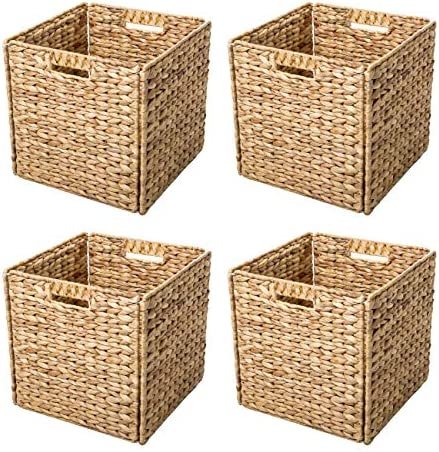 These beautiful storage baskets measure 11.8″L x 11.8″W x 11.8″H . They fold flat for easy storage when not in use. Made from water hyacinth over an iron wire frame. These will enhance your décor while being a useful place to store towels, books, magazines or any number of household items. By Trademark Innovations.