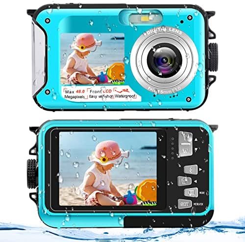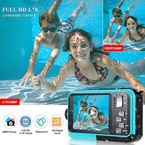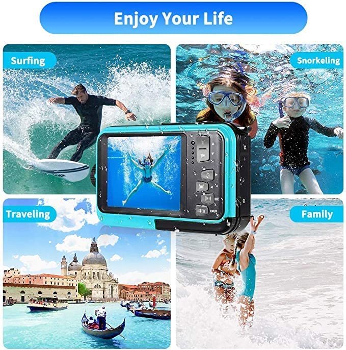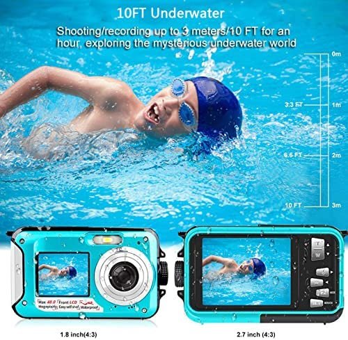 10FT Underwater Camera & Dual screens – This underwater camera is equipped with the waterproof designed for underwater world, you can dive up to 10 feet. It is ideal for water sports, including swimming, drifting, surfing, snorkeling, etc. With the front 2.7 inches screen and rear 1.8 inches screen, you can record every memorable moment and take a selfie easily.